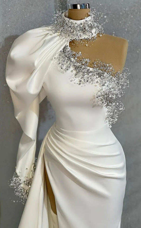 RP512-Elegant White Mermaid High Neck Ruched Beads Pearls Satin Long Sleeves Prom Evening Dresses Formal Party Gowns With High Split