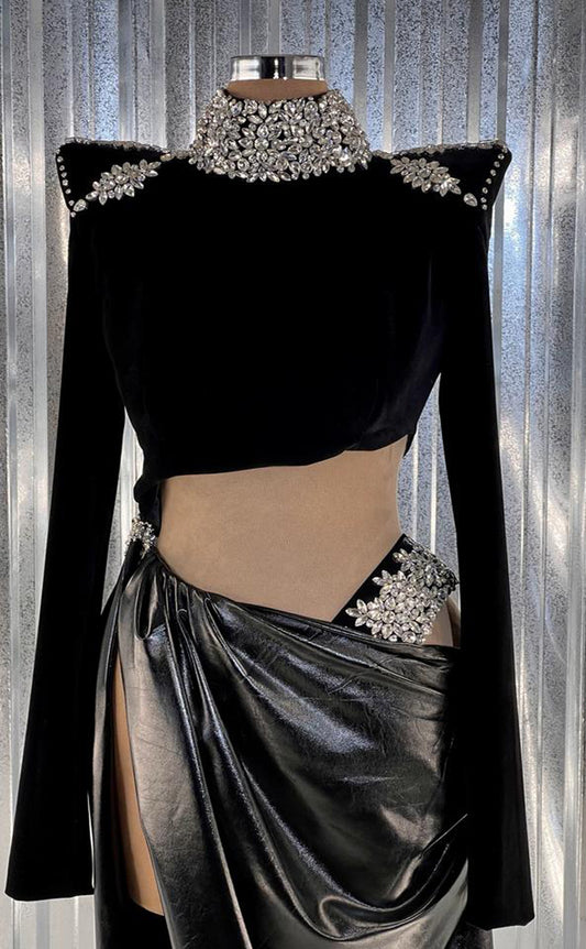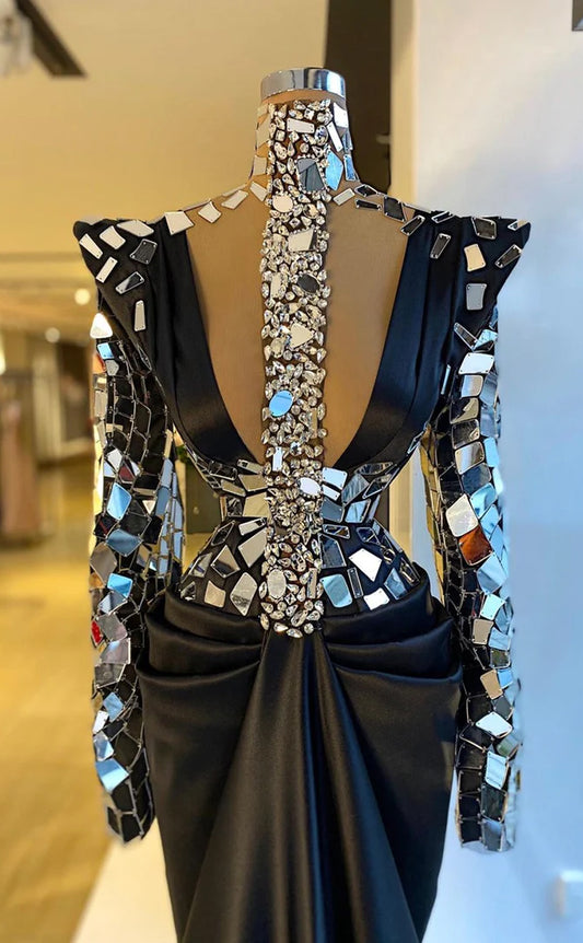 RP520-Luxury Black Mermaid High Neck Ruched Crystals Mirrors Long Sleeves Prom Evening Dresses Formal Party Gowns