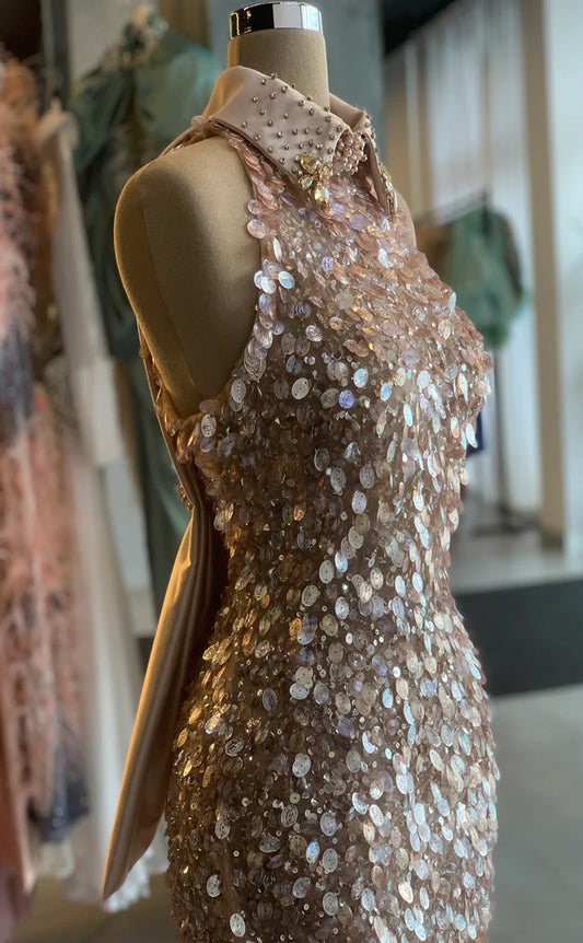 RP517-Sparkling Champagne Mermaid High Neck Sequins Beaded Sleeveless Prom Evening Dresses Formal Party Gowns