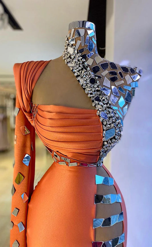 RP521-Luxury Orange Mermaid High Neck Ruched Crystals Mirrors Long Sleeves Prom Evening Dresses Formal Party Gowns