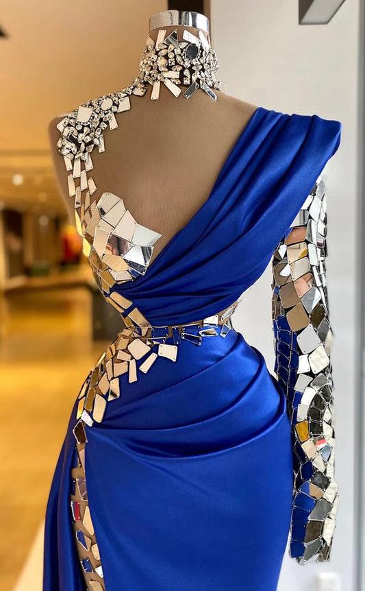 RP420-Elegant Royal Blue Mermaid High Neck Sequins Beads Ruched One Long Sleeve Long Prom Evening Dresses Formal Party Gowns With Slit