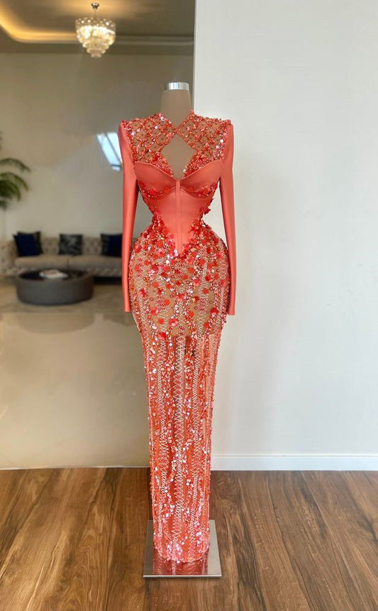 RP525-Luxurious Mermaid High Neck Sequins Beads Flowers Long Sleeves Floor Length Prom Evening Dresses Formal Party Gowns