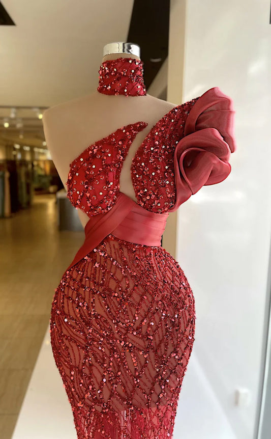 RP529-Luxurious Red Mermaid High Neck Sequins Beaded Sleeveless Floor Length Prom Evening Dresses Formal Party Gowns