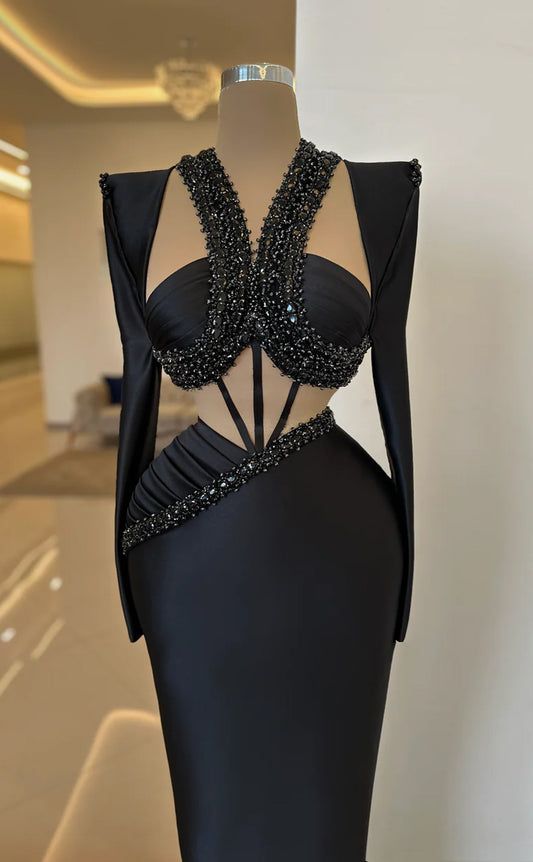 RP542-Gorgeous Black Mermaid Halter Beads Ruched Long Sleeves Floor Length Prom Evening Dresses Formal Party Gowns
