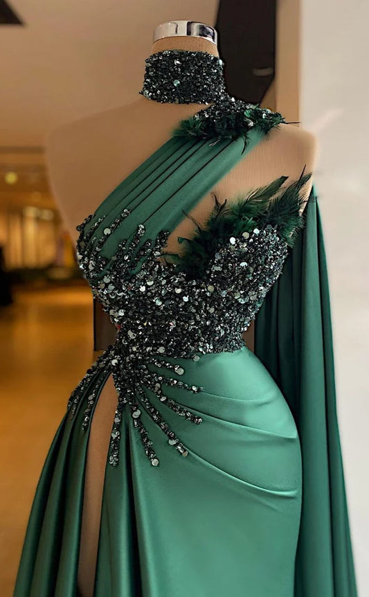RP549-Gorgeous Green Mermaid High Neck Sequins Ruched Feathers Sleeveless Long Prom Evening Dresses Formal Party Gowns With Slit
