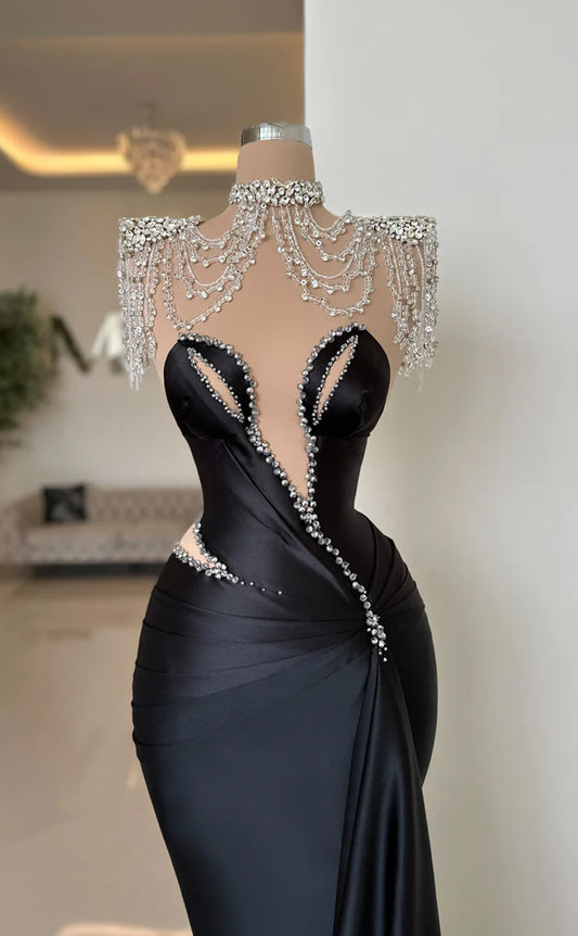 RP550-Gorgeous Black Mermaid High Neck Beaded Ruched Tassel Sleeveless Floor Length Prom Evening Dresses Formal Party Gowns