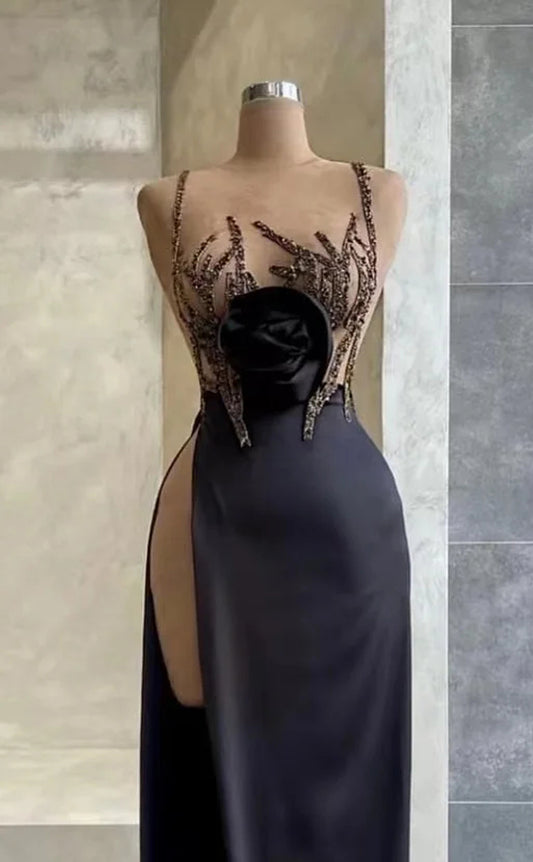 RP065-Black Mermaid Scoop Sleeveless Backless High Side Slit Beaded Long Satin Prom Dresses Special Occasion Party Evening Gowns