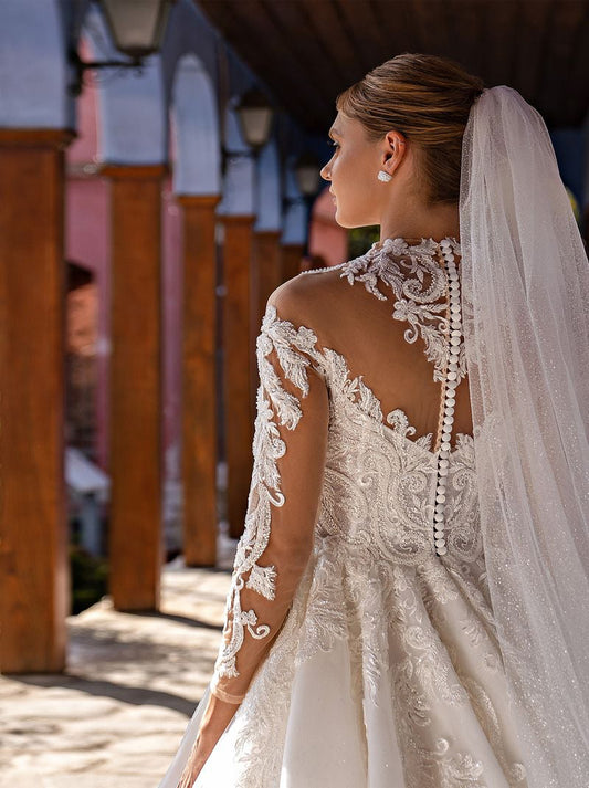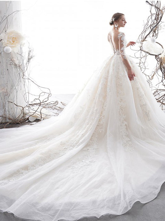Modern Ball Gown Wedding Dresses Jewel Appliqued Beads Long Sleeves Tulle Sweep Train Satin Bridal Gowns Custom