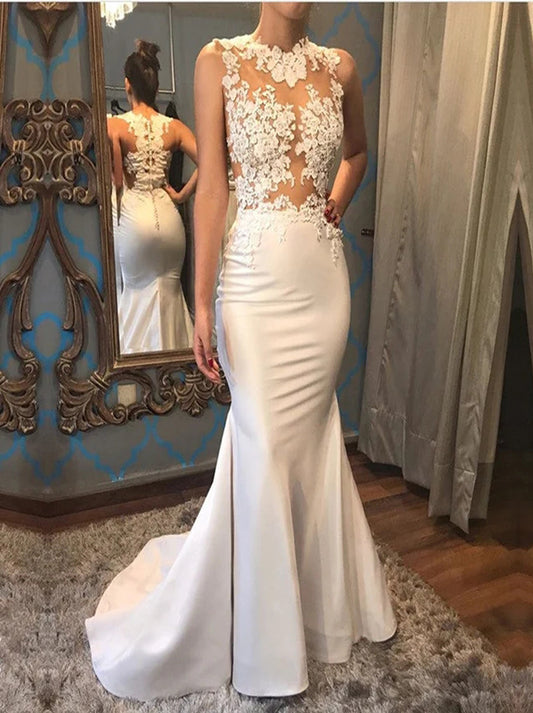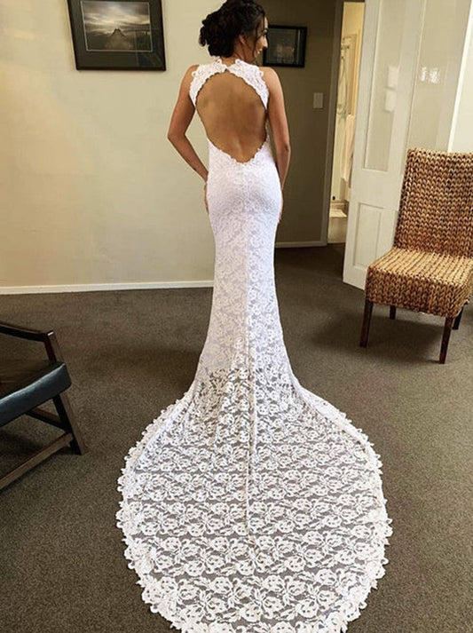 Sexy Mermaid Wedding Dresses Jewel Sleeveless Appliqued Front Slit Backless Court Train Lace Bridal Gowns Custom Made