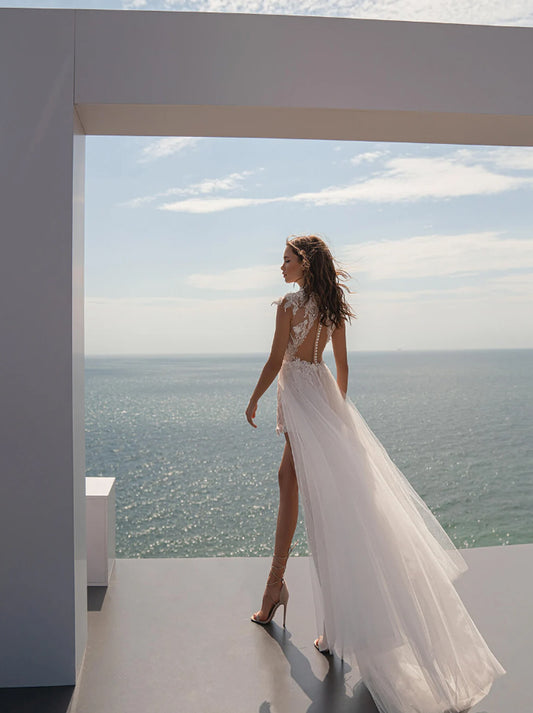 Modern A-Line Wedding Dresses Jewel Appliqued Sash Sleeveless Floor Length Tulle Bridal Gowns Custom Made