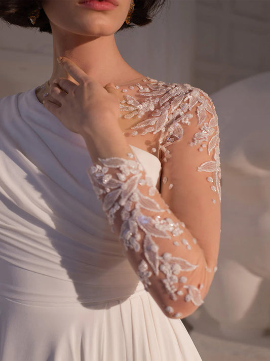 Chic & Modern A-Line Wedding Dresses Jewel Pleats Apppliqued Sheer Lace Long Sleeves Boho Sweep Train Bridal Gowns With Slit