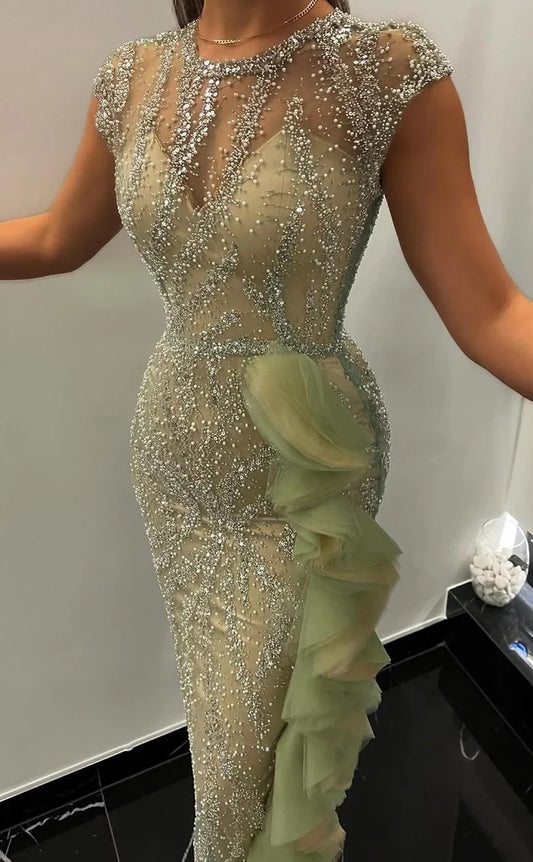 RP1013-Unique Mermaid Jewel Neck Beads Ruffles Cap Sleeves Prom Evening Dresses Formal Party Gowns