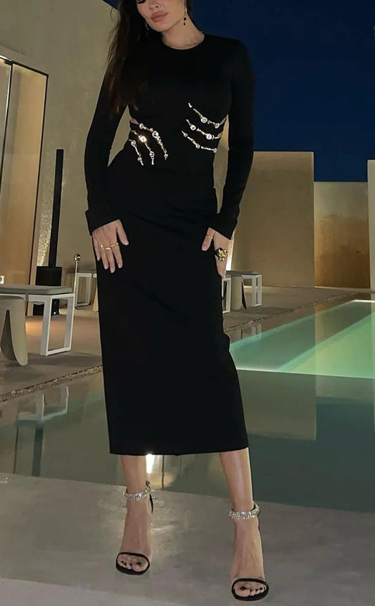 RP1001-Elegant Black Sheath Jewel Neck Crystals Long Sleeves Satin Long Prom Evening Dresses Formal Party Gowns