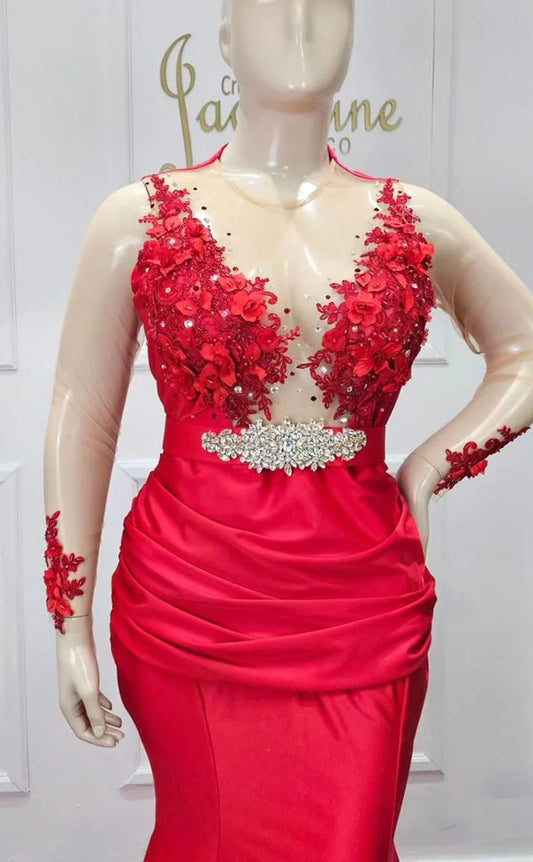 RP1446-Gorgeous Red Mermaid Jewel Appliqued Beaded Long Sleeves Prom Evening Dresses Formal Party Gowns With Train