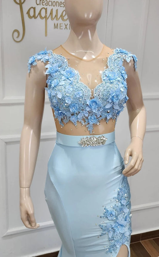 RP1448-Gorgeous Sky Blue Mermaid Jewel Appliqued Beaded Cap Sleeves Prom Evening Dresses Formal Party Gowns With Slit