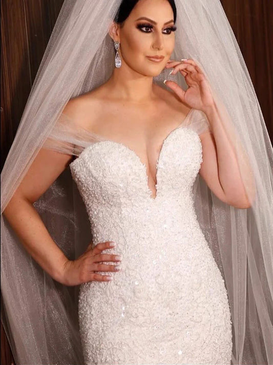 Sparkling Mermaid Wedding Dresses Strapless Off The Shoulder Lace Up Beads Sequins Sweep Train Bridal Gowns Custom Made