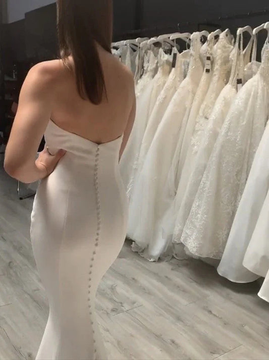 Simple Mermaid Wedding Dresses Sweetheart Sleeveless Pleated Covered Buttons Satin Sweep Train Bridal Gowns Custom Made