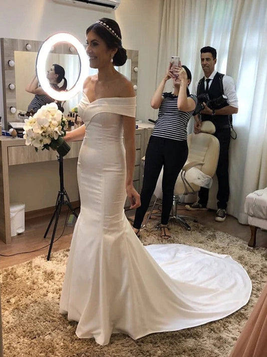 Charming Mermaid Wedding Dresses Off The Shoulder Appliqued Sweep Train Lace Bridal Gowns Custom Design