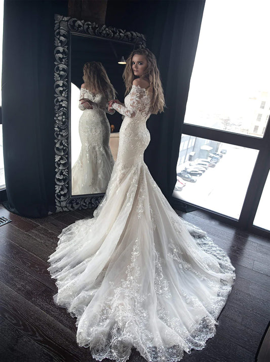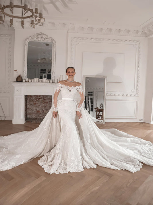 Luxurious Mermaid Wedding Dresses Off The Shoulder Beaded Appliqued Lace Illusion Long Sleeves Covered Buttons Tulle Bridal Gowns Custom Design With Detachable Long Train