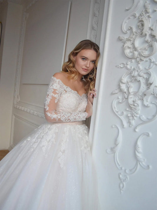 Modern Ball Gown Wedding Dresses Off The Shoulder Long Sleeves Appliqued Sweep Train Tulle Bridal Gowns Custom Made
