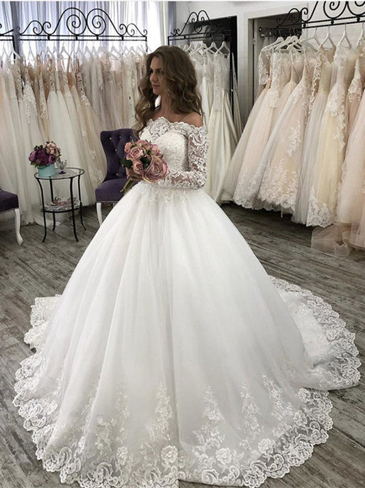 Romantic Ball Gown Wedding Dresses Off The Shoulder Long Sleeves Appliqued Tulle Court Train Bridal Gowns Custom Made