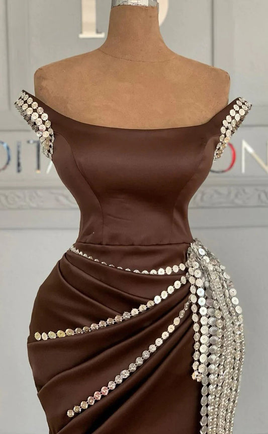 RP1682-New Brown Mermaid Off-the-Shoulder Ruched Sequined Sleeveless Satin Prom Evening Dresses Formal Party Gowns