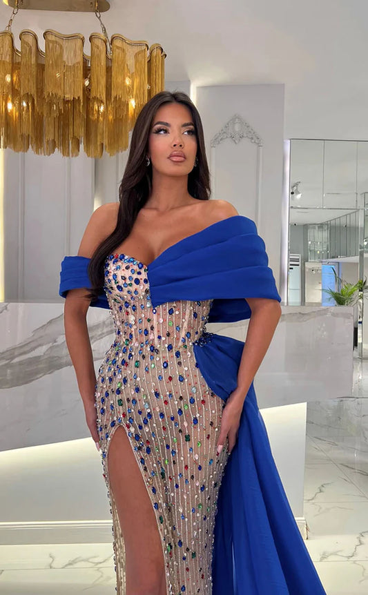 RP1700-Sparkling Royal Blue Mermaid Off-the-Shoulder Crystals Cap Sleeves Prom Evening Dresses Formal Party Gowns With Slit