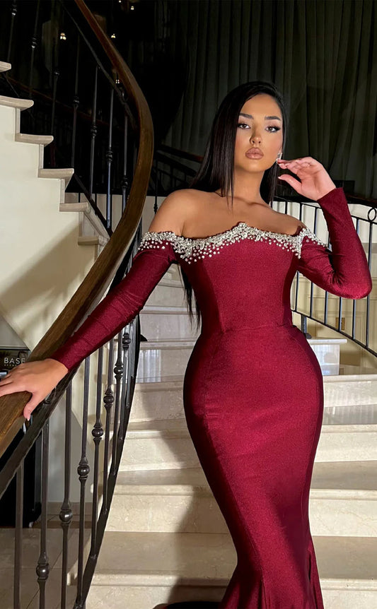 RP1740-Elegant Burgundy Mermaid Off-the-Shoulder Crystals Long Sleeves Prom Evening Dresses Formal Party Gowns With Train