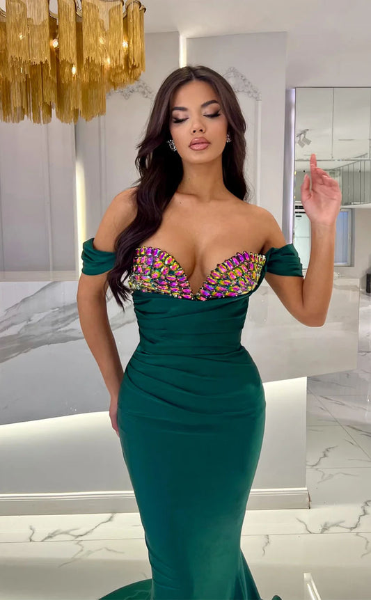 RP1737-Elegant Green Mermaid Off-the-Shoulder Crystals Ruched Cap Sleeves Prom Evening Dresses Formal Party Gowns With Train