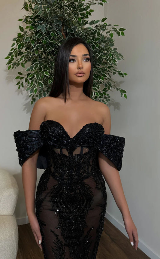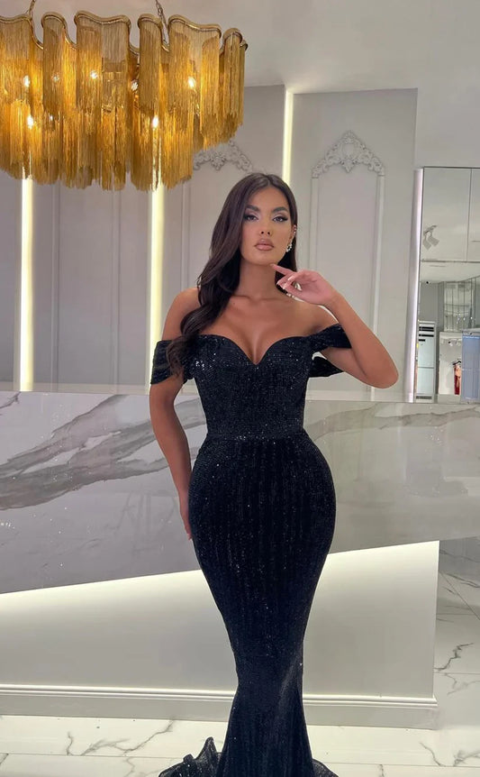 RP1724-Sparkling Black Mermaid Off-the-Shoulder Appliqued Beaded Cap Sleeves Floor Length Prom Evening Dresses Formal Party Gowns