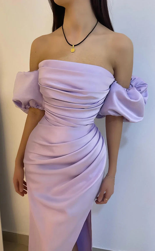 RP1813-Elegant Lavender Mermaid Off-the-Shoulder Ruched Sleeveless Satin Prom Evening Dresses Formal Party Gowns With Slit