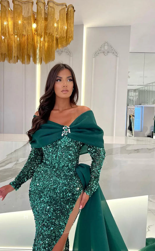 RP1858-Luxurious Green Mermaid Off-the-Shoulder Sequins Long Sleeves Sequins Prom Evening Dresses Formal Party Gowns With Slit