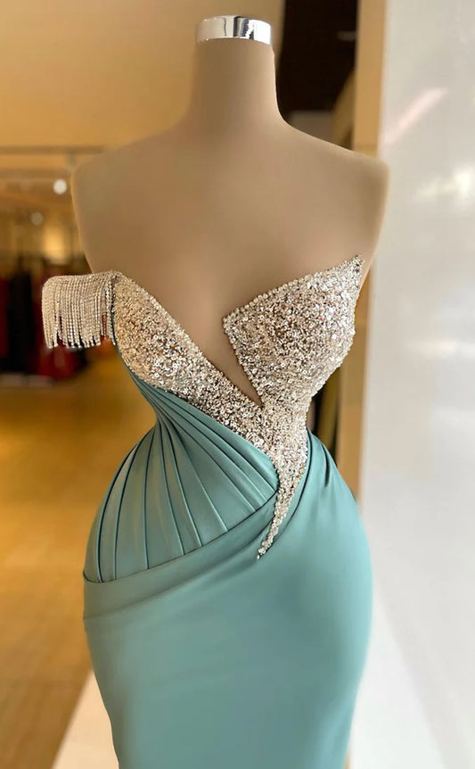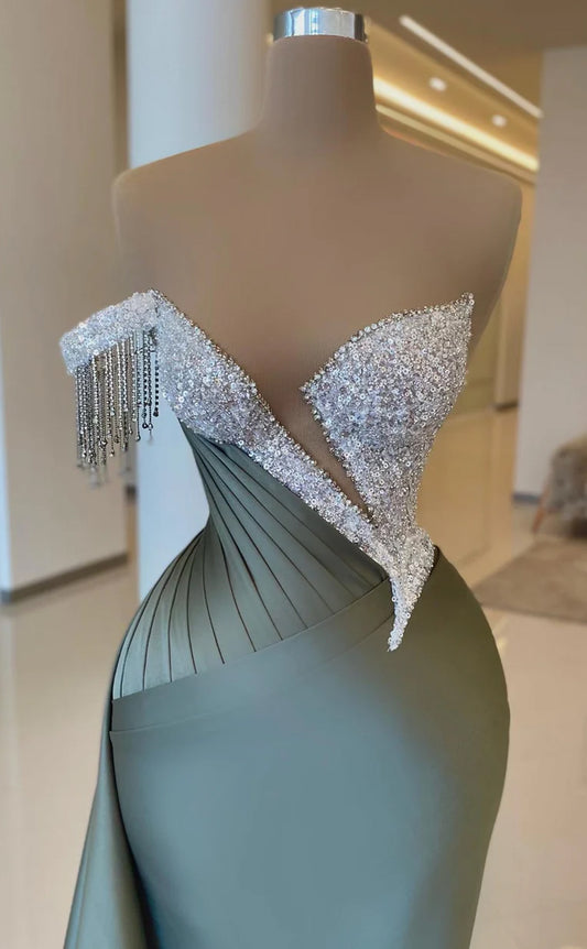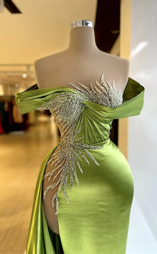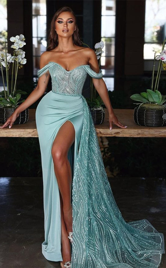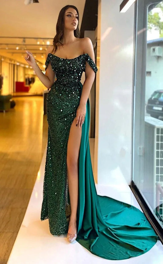RP617-Sparkling Green Mermaid Off-the-Shoulder Beads Sequins Cap Sleeves Long Prom Evening Dresses Formal Party Gowns With Slit
