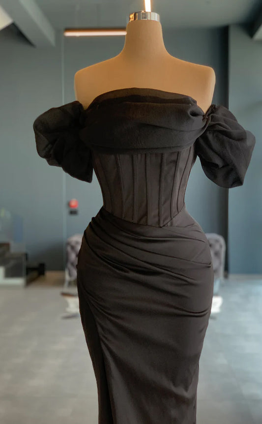 RP506-Simple Black Mermaid Off-the-Shoulder Ruched Cap Sleeves Satin Floor Length Prom Evening Dresses Formal Party Gowns
