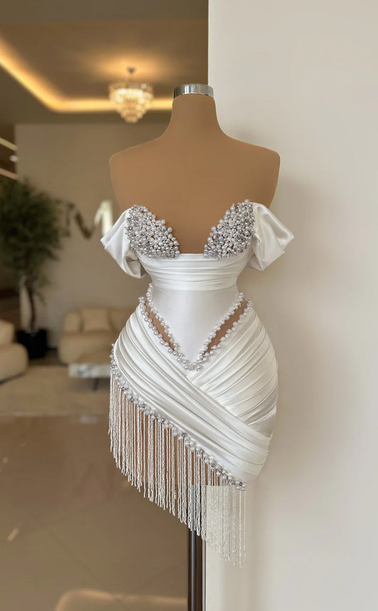 RP672-Cute White Mermaid Off-the-Shoulder Pearls Ruched Tassel Cap Sleeves Satin Short Prom Evening Dresses Formal Party Gowns