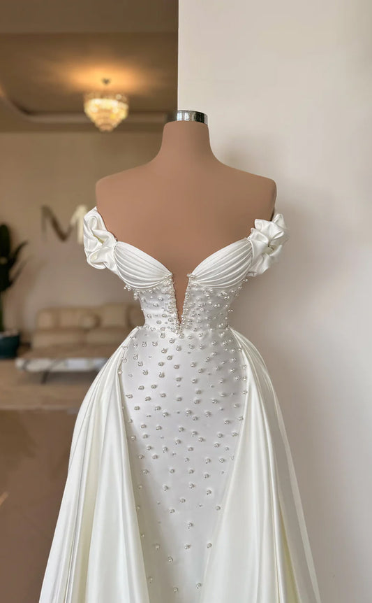 RP670-Elegant White Mermaid Off-the-Shoulder Pearls Ruched Cap Sleeves Satin Long Prom Evening Dresses Formal Party Gowns
