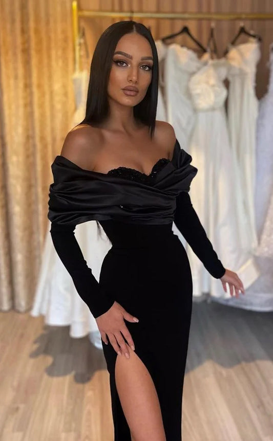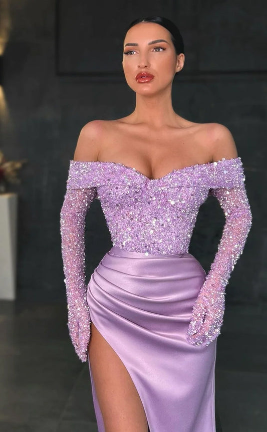 RP705-Charming Mermaid Off-the-Shoulder Beads Sequins Long Sleeves Long Prom Evening Dresses Formal Party Gowns With Slit