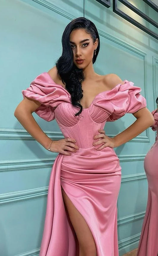 RP728-Elegant Pink Mermaid Off-the-Shoulder Ruched Cap Sleeves Long Prom Evening Dresses Formal Party Gowns With Slit