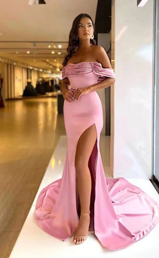 RP747-Elegant Pink Mermaid Off-the-Shoulder Ruched Beads Cap Sleeves Long Prom Evening Dresses Formal Party Gowns With Slit