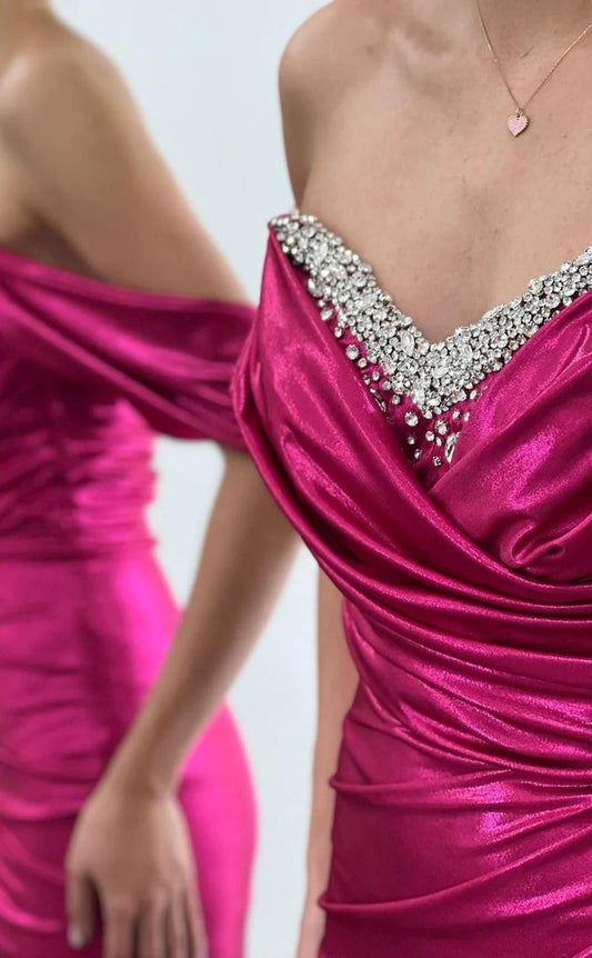 RP734-Elegant Fuchsia Mermaid Off-the-Shoulder Ruched Crystals Cap Sleeves Long Prom Evening Dresses Formal Party Gowns With Slit