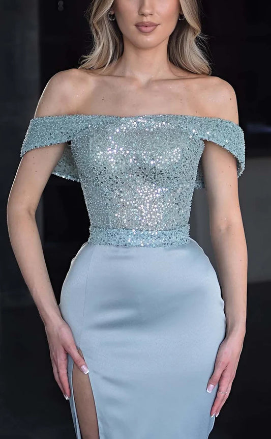 RP800-New Sky Blue Mermaid Off-the-Shoulder Sequins Cap Sleeves Long Prom Evening Dresses Formal Party Gowns With Slit