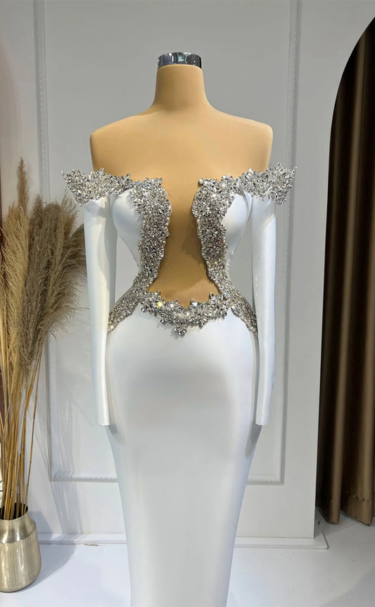 RP254-White Mermaid Off-the-Shoulder Beads Crystals Cap Sleeves Prom Evening Dresses Formal Party Gowns