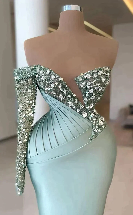 RP362-Gorgeous Mermaid Off-the-Shoulder Pleated Crystals Sequined One Long Sleeve Prom Evening Dresses Formal Party Gowns