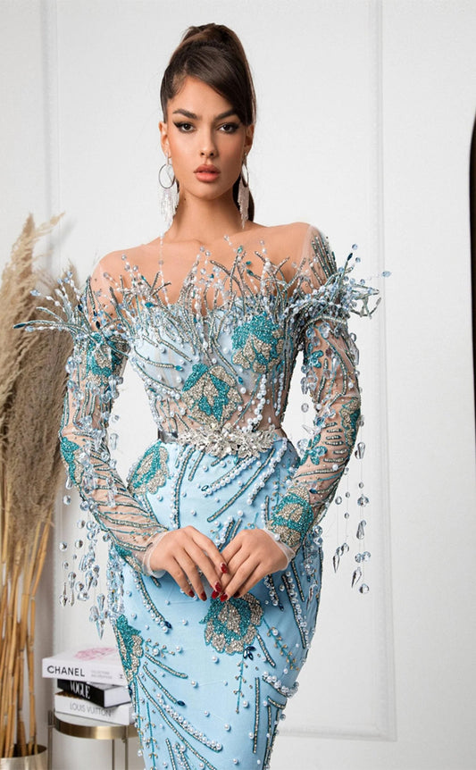 RP291-Luxury Sky Blue Mermaid Off-the-Shoulder Beads Crystals Tassel Long Sleeves Prom Evening Dresses Formal Party Gowns With Appliqued