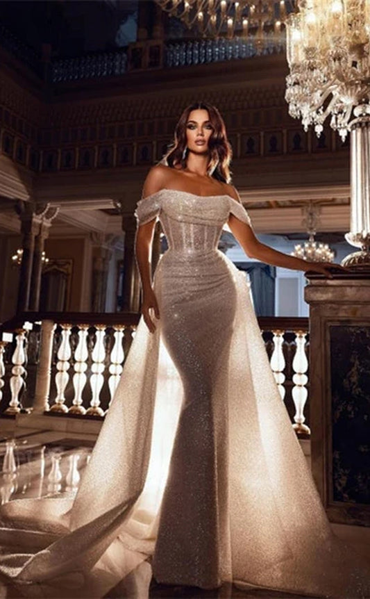 RP386-Sparkling Mermaid Off-the-Shoulder Sequins Sleeveless Detachable Train Long Prom Evening Dresses Formal Party Gowns With Side Slit