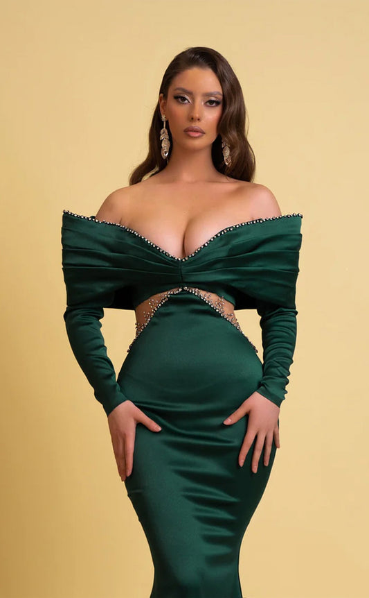 RP347-Elegant Green Mermaid Off-the-Shoulder Beads Pleated Long Sleeves Prom Evening Dresses Formal Party Gowns