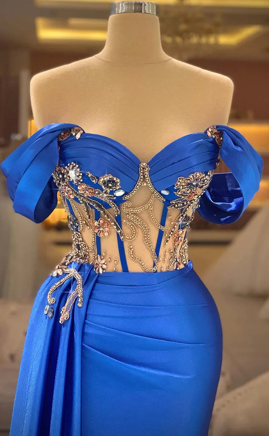 RP394-Gorgeous Blue Mermaid Off-the-Shoulder Crystals Beaded Ruched Cap Sleeves Satin Prom Evening Dresses Formal Party Gowns With Slit