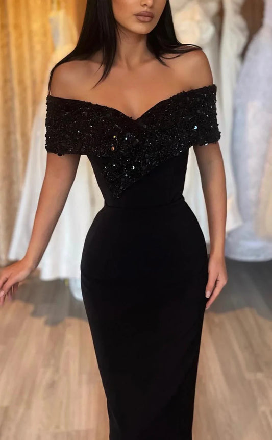 RP426-Elegant Black Mermaid Off-the-Shoulder Sequins Beads Cap Sleeves Long Prom Evening Dresses Formal Party Gowns