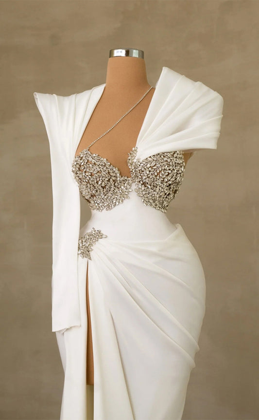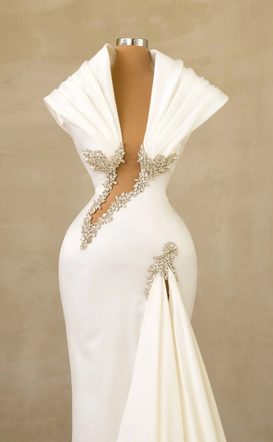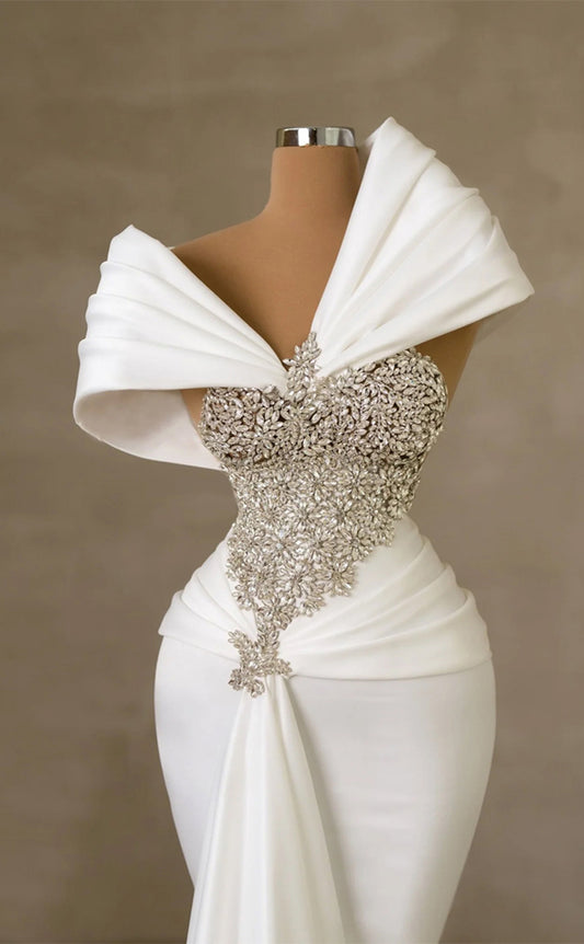 RP257-White Mermaid Off-the-Shoulder Beads Crystals Cap Sleeves Prom Evening Dresses Formal Party Gowns With Pleated