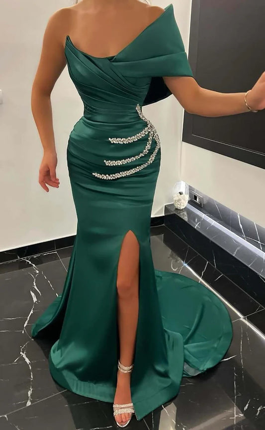 RP796-Green Mermaid One Shoulder Ruched Beads Sleeveless Long Prom Evening Dresses Formal Party Gowns With Slit